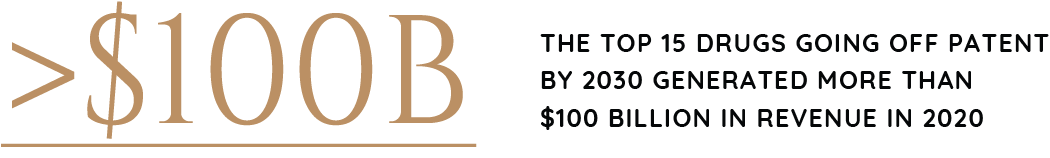 The fundamentals of healthcare M&A forecast to remain strong. Between large cash balances (the top 25 pharma, medtech, and payer companies all have at least 15% of their past year's revenue in cash) and the growth potential of M&A, corporate solid deal activity is expected to increase. This is especially true for the pharmaceutical sector. The top 15 drugs going off patent by 2030 generated over $100 billion in revenue in 2020.