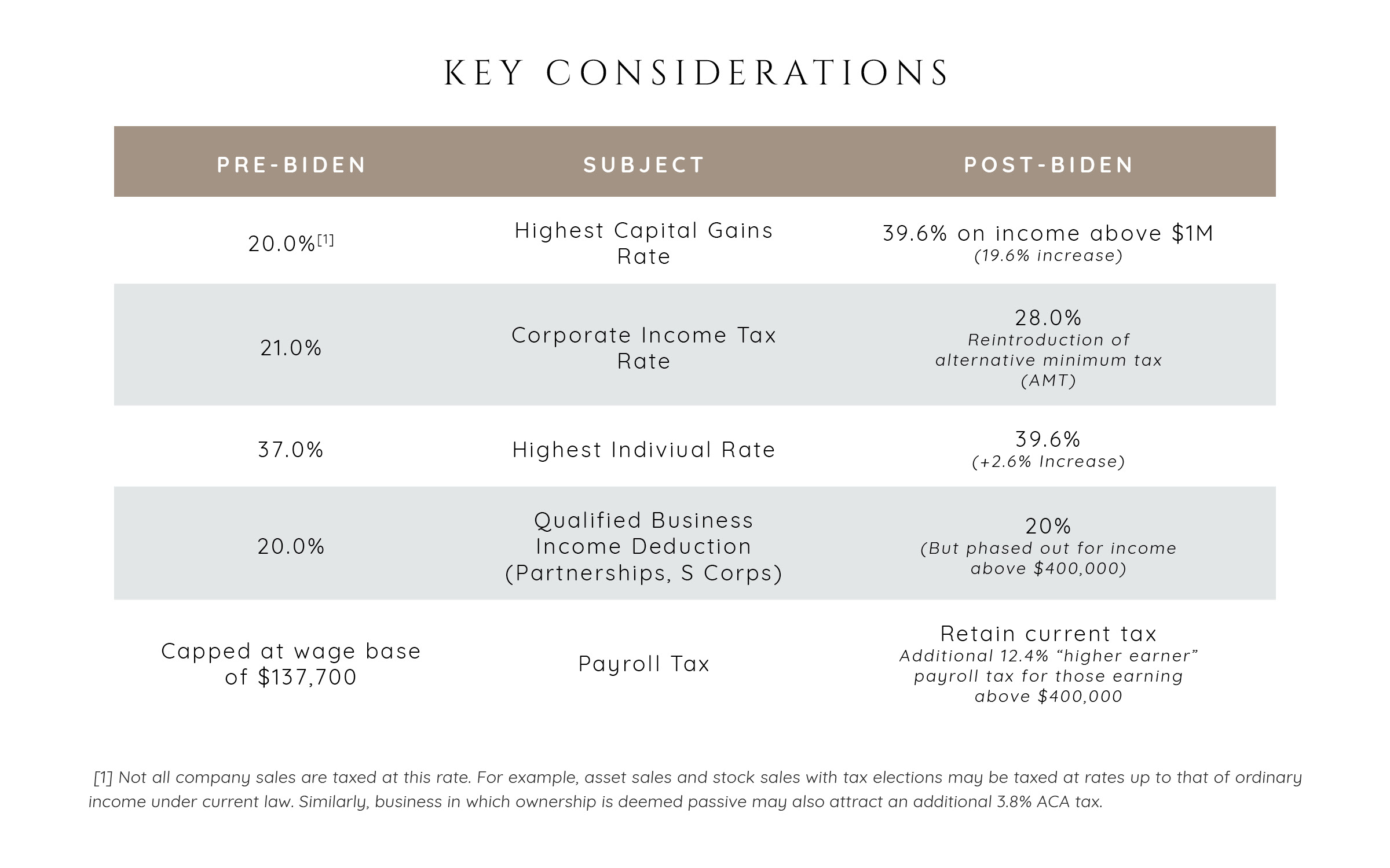 The Biden Plan has considerable impact to business owners; careful consideration to the timing of an exit and liquidity strategy needs to be at the mind’s forefront as the 2020 election quickly approaches. If endorsed, the plan impacts owners directly through the implementation of new tax obligations or the elimination of tax benefits. This includes a 19.6 percent increase on the tax rate of material long-term capital gains for those with adjusted gross income (AGI) exceeding $1M, and a 7 percent increase in the overall corporate income tax rate as noted in the table below.