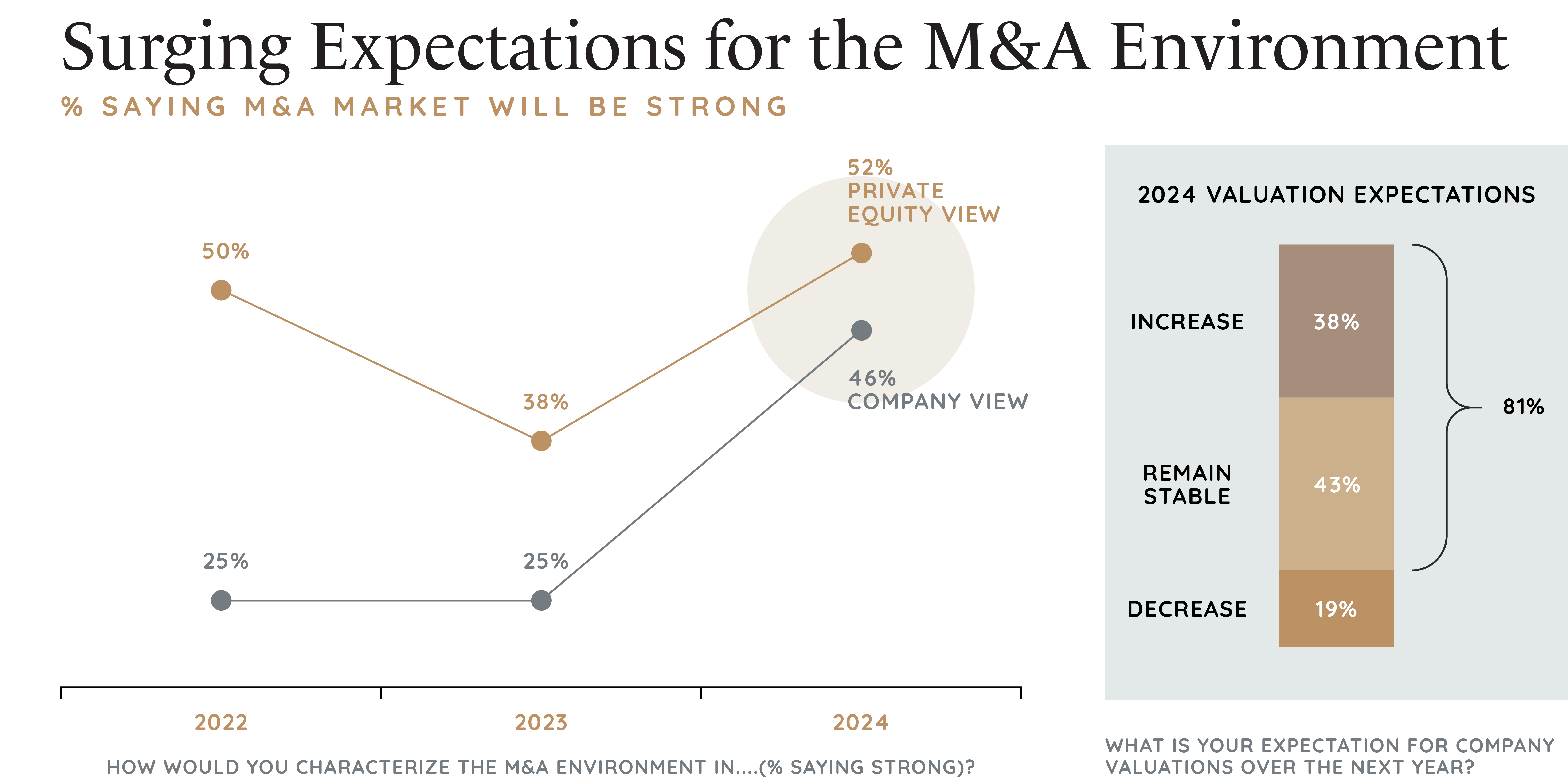 The good news is that fewer middle market companies face fewer operating obstacles, such as commodity prices, rising interest rates, and labor market issues in 2024. The overall economic outlook is also more optimistic than last year, with 46% of middle-market businesses and 50% of private equity firms expecting U.S. economic conditions to improve this year. Of those who expect a better economy, 68% are likely to engage in M&A activity in 2024.
