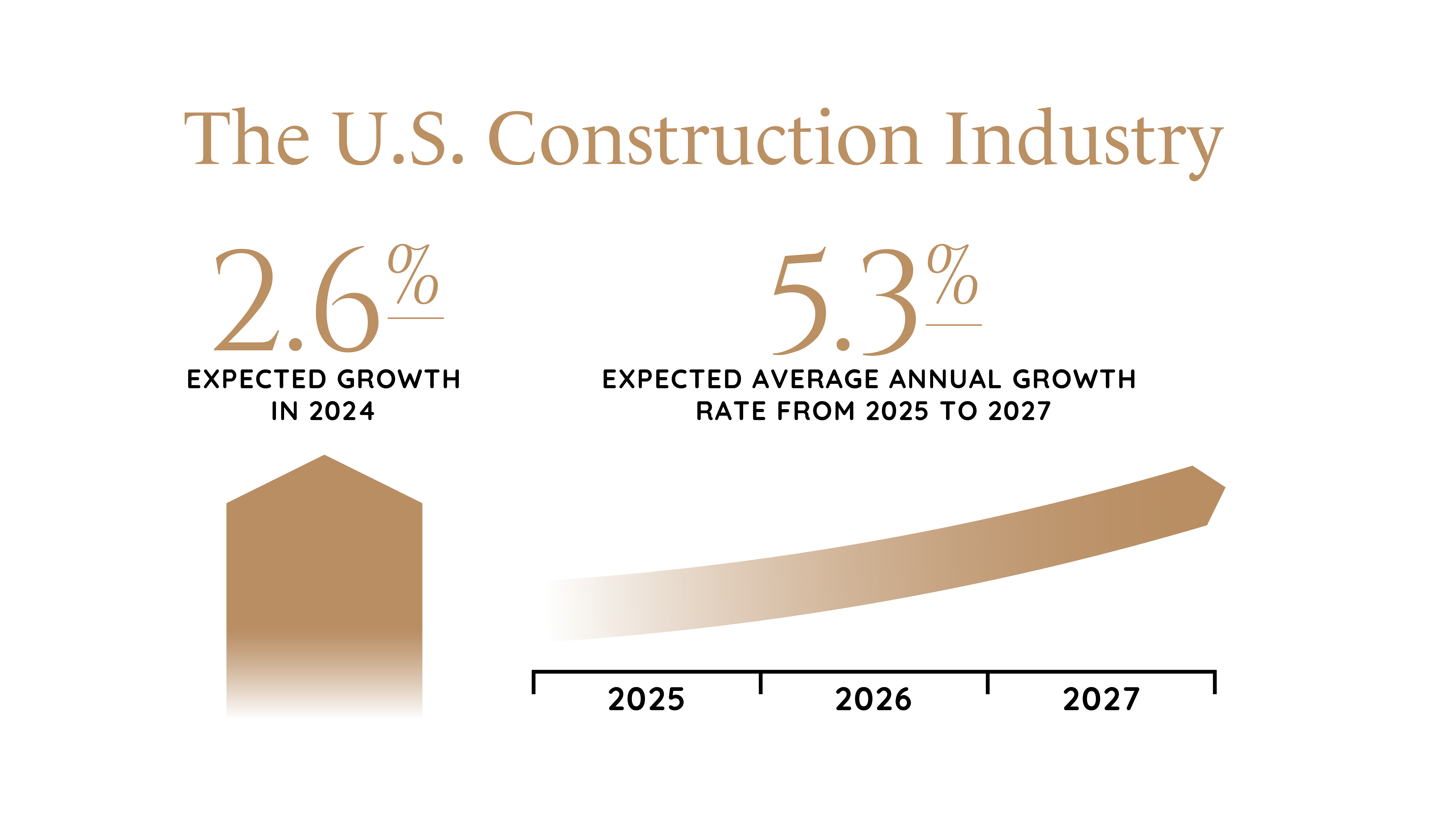 The U.S. construction industry expects to grow by 2.6% in 2024 and, on average, an annual growth rate of 5.3% from 2025 to 2027. Energy, transportation, housing, and manufacturing investments will drive this growth.